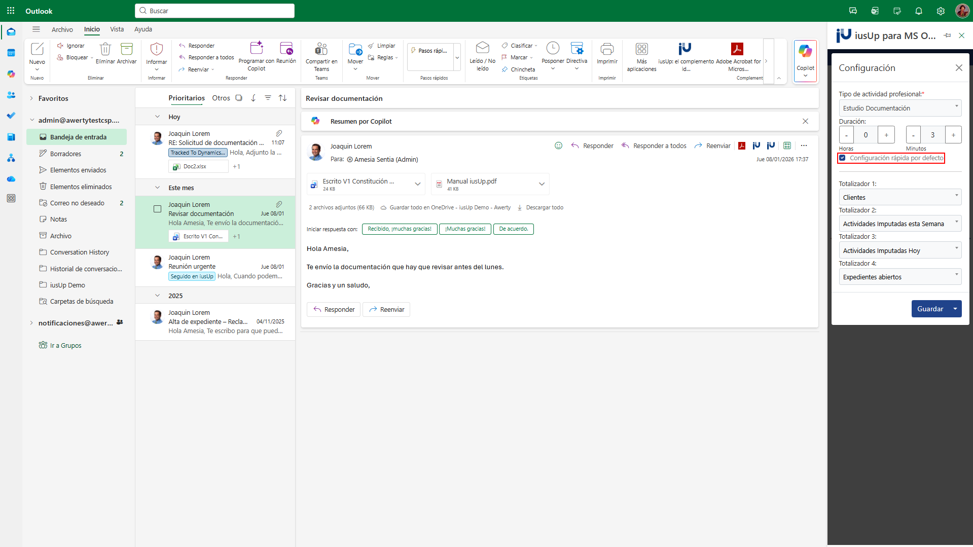 Para activar el seguimiento automático, mientras, debes desplazar el check situado al lado de la leyenda «Configuración rápida». Al hacerlo, únicamente deberás informar el Expediente correspondiente al correo y desplazar los checks correspondientes a los adjuntos y el contenido del correo de acuerdo con lo que te interese en ese momento. El tipo de actividad por defecto, en este caso, puede establecerse desde el apartado configuración. Para ello, deberás marcar el check correspondiente a «Configuración rápida por defecto», tal y como puedes comprobarlo en la imagen que te mostramos a continuación.