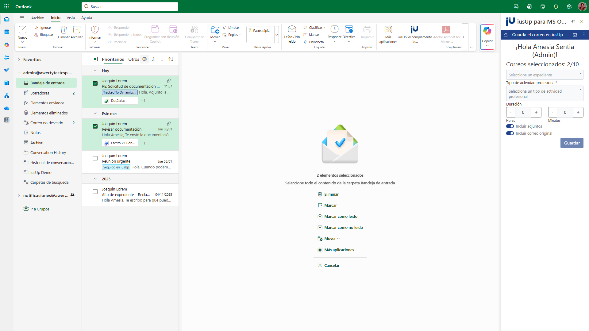 Otra de las cuatro funciones de nuestro complemento para Outlook que queremos presentarte es la selección múltiple de correos para aplicarles su correspondiente seguimiento relacionado con un Expediente en concreto. De esta manera, se generará una actividad de seguimiento para cada uno de los correos seleccionados, sin que tengas que hacer nada más. Su funcionamiento resulta muy sencillo. Para aprovechar esta opción, en primer lugar, debes seleccionar varios correos recibidos. Y, una vez hecho esto, deberás activar el seguimiento, tal y como puedes ver en la siguiente imagen.