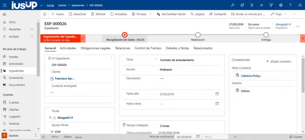 Desde la entidad expediente, además, puedes contar con un control total de las obligaciones legales, con aviso de vencimiento, de las imputaciones y de los suplidos, pagos a cuenta y notas de gasto. La gestión de expedientes se integra a su vez con el correo electrónico y la agenda de Outlook, gracias a la integración nativa con las herramientas de Microsoft 365 y permite la existencia de múltiples expedientes vinculados a un contrato. Con iusUp, podrás además inspeccionar pormenorizadamente cada uno de los expedientes con los que estés trabajando. E, incluso, acceder a ellos en función de cuál haya sido el responsable de llevar a cabo las diferentes tareas, ya sea un profesional, un colaborador o un departamento.