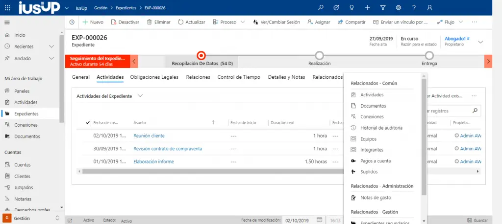 Una de las características que te ofrece iusUp para lograr una gestión de expedientes más eficiente es la gestión a través de dos entidades. La gestión administrativa, para personal del ámbito administrativo o financiero, se lleva a cabo desde el contrato. La gestión operativa, la del día a día para el profesional del despacho, mientras, se lleva a cabo desde el expediente. Desde esta entidad, una de las principales con las que trabaja nuestra solución, se pueden llevar a cabo múltiples acciones. Incluso, si lo deseas, puedes establecer un proceso para determinados tipos de expediente y ver en todo momento en qué fase del mismo se encuentran.