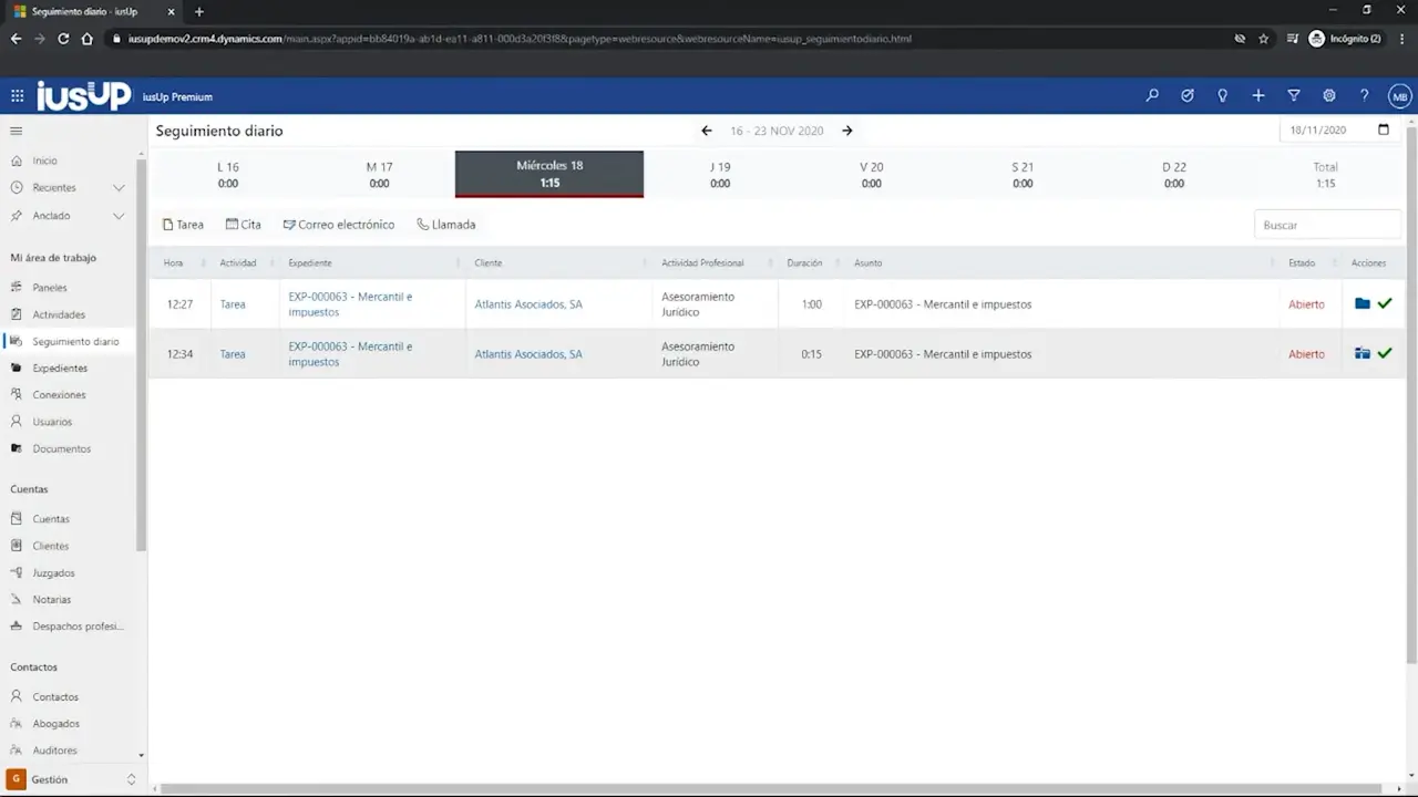 Seguimiento Diario es la funcionalidad de iusUp destinada a facilitar tanto el control de las actividades como su correspondiente minutación. Con ella puedes comprobar, prácticamente de un vistazo qué tareas tienes aún pendientes de realizar. Y, también, acceder a las que ya completaste en el pasado. Todo, con una interfaz de usuario sencilla y fácil de comprender, para que esta tarea, que puede llegar a consumir mucho tiempo, te resulte mucho más ligera. Así, podrás centrarte en todo momento en aquellas tareas que consideres más urgentes, con lo que podrás aumentar también tu productividad.