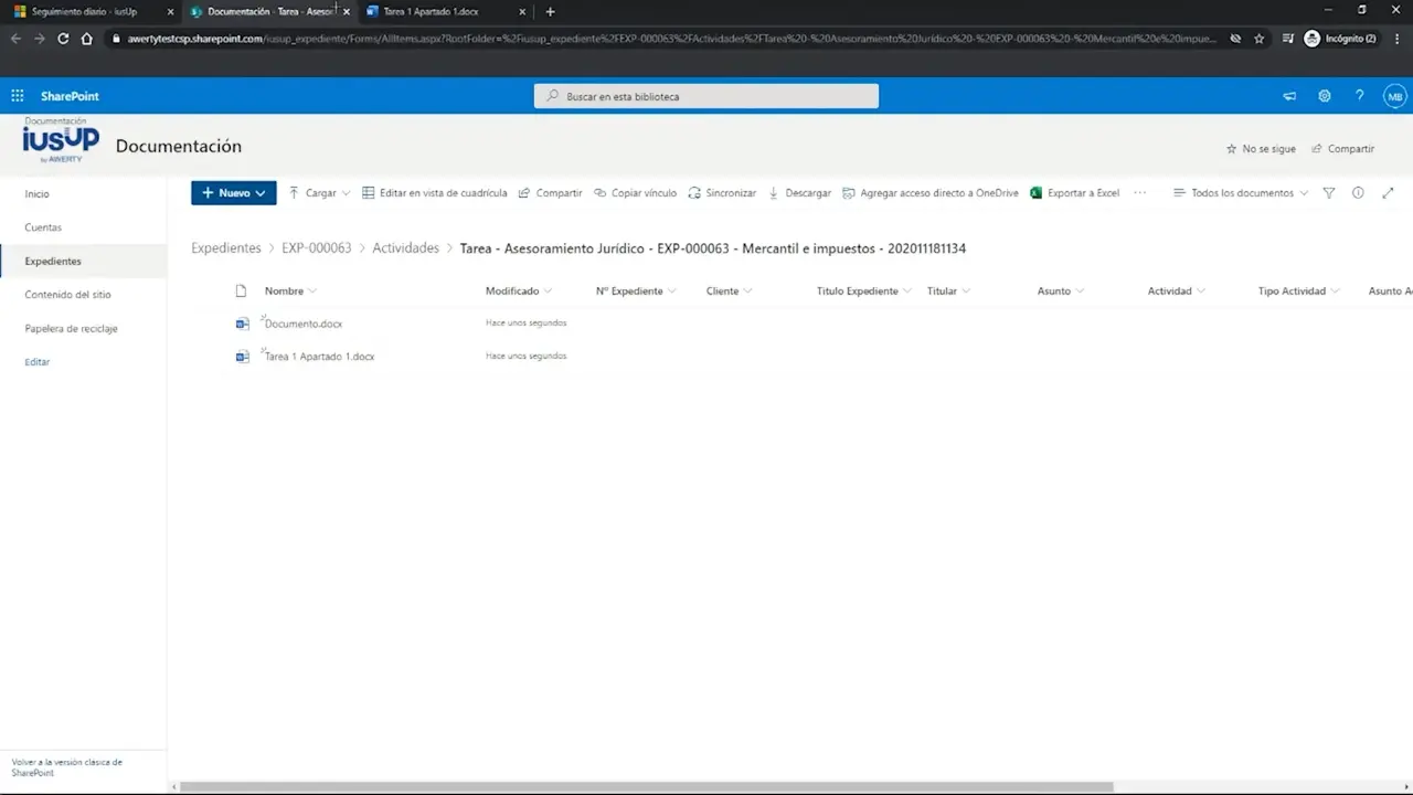Si haces clic en el icono de carpeta abierta, el sistema te mostrará la documentación relacionada con esa tarea que se encuentra almacenada en SharePoint. Así puedes comprobarlo en la imagen que se muestra a continuación. Así, podrás consultarla en todo momento, tanto mientras estás llevando a cabo la actividad como una vez la hayas dado por terminada.
