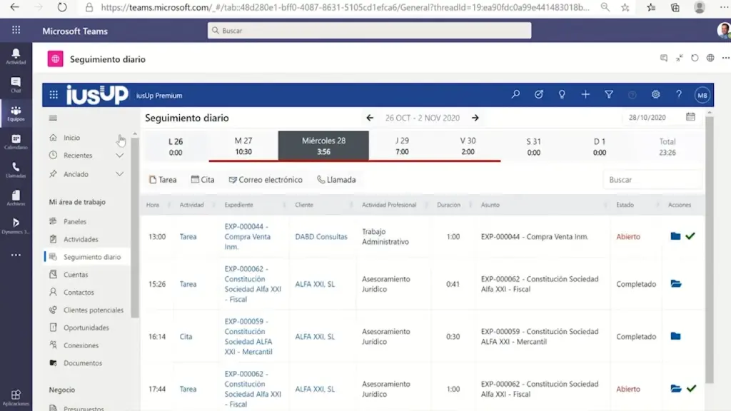 A través de Seguimiento Diario, el sistema muestra una serie de totalizadores de tiempo de trabajo que permite ir introduciendo fácilmente y con agilidad las actuaciones que estamos llevando a cabo. Y, también, aquellas que vamos a realizar en un futuro más o menos inmediato. De tal manera, que incluso podremos darlas por completadas y validadas por medio de un único clic. Siempre, además, con la posibilidad de acceder a la documentación relacionada pertinente a cada actividad, los Clientes y Expedientes con los que se trabaja en el día a día del despacho. E, incluso, puedes sincronizarla con el calendario y correos de Outlook e integrarse de forma completamente nativa con Microsoft Teams.
