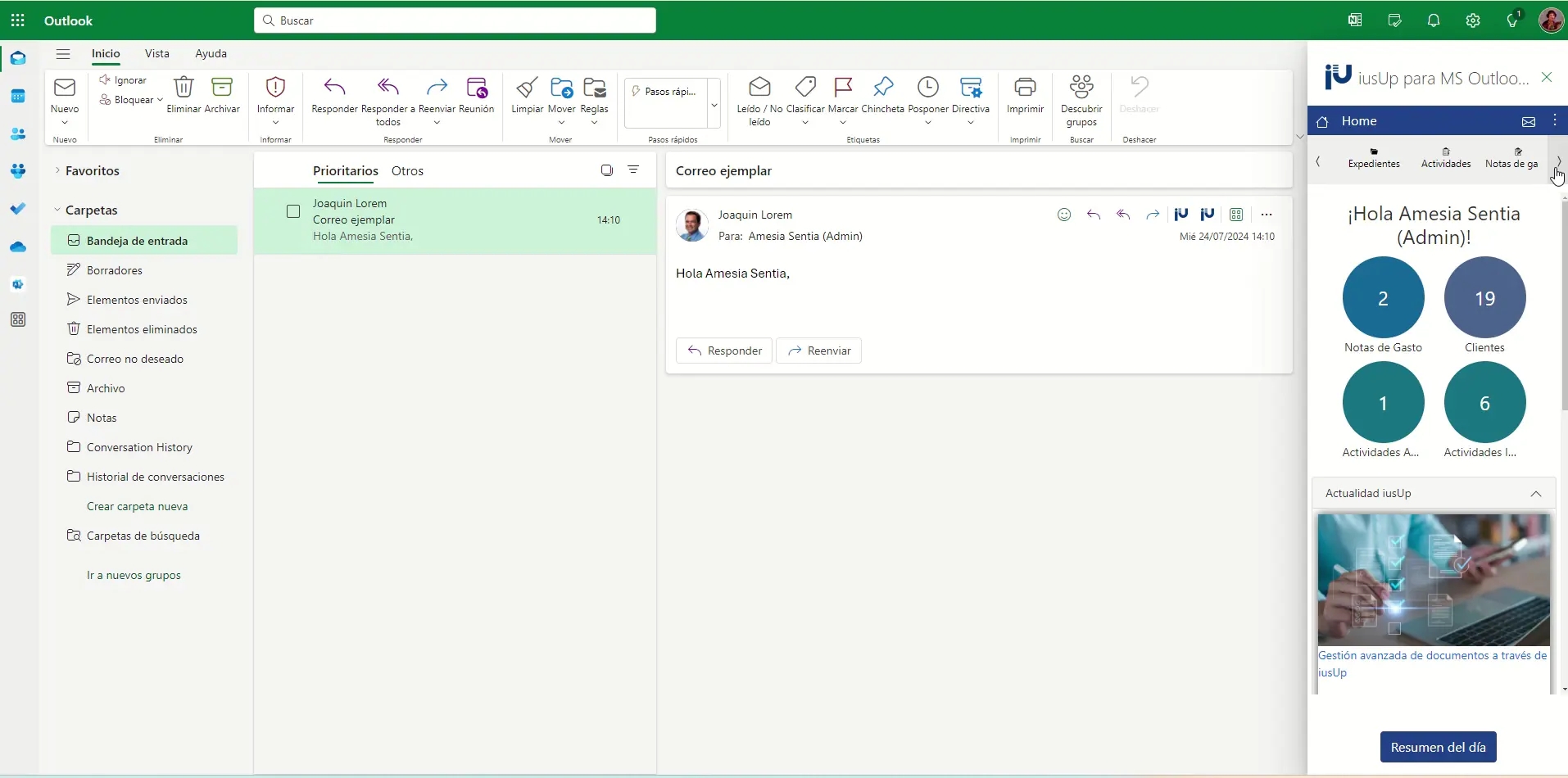 Ahora, para que este complemento facilite aún más la obtención de la máxima eficiencia al trabajar con el correo electrónico y permita un trabajo sin interrupciones, hemos introducido una nueva página de Inicio. Esta actualización está diseñada para que los abogados puedan gestionar sus Expedientes, Clientes, Actividades y Notas de gasto directamente desde Outlook, sin necesidad de acceder a la aplicación web de iusUp y aportarle al profesional la siguiente lista de características: