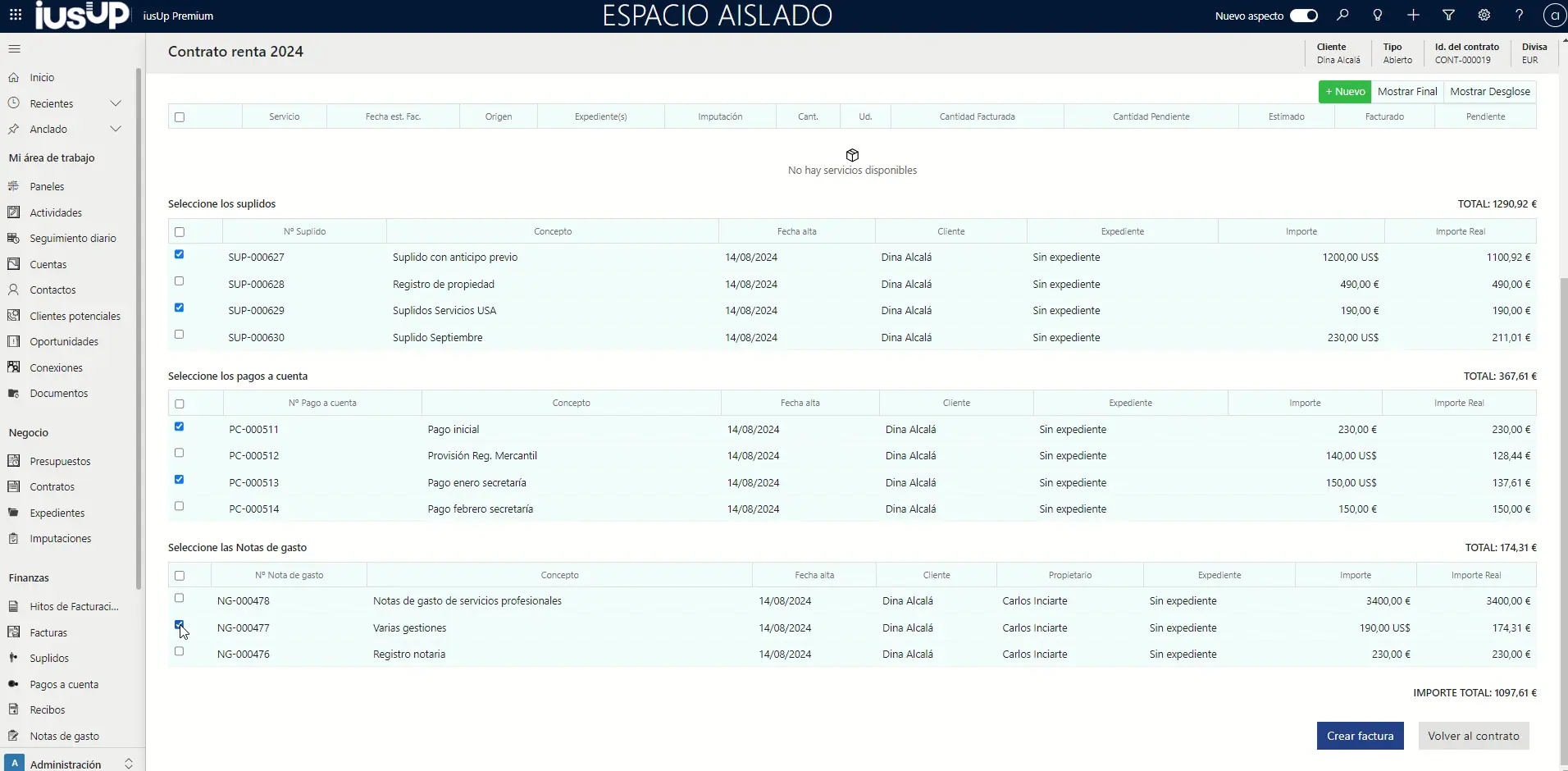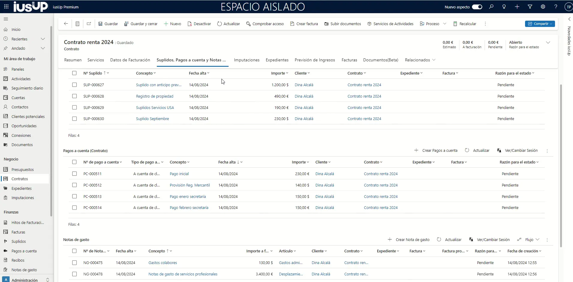Vamos a ver un ejemplo sobre cómo se aplica la gestión multidivisa en iusUp en el caso de los pagos a cuenta, notas de gasto y suplidos. En este caso, vamos a ver un contrato en que estas entidades están expresadas tanto en dólares como en euros, a pesar de que la moneda base es el euro. Así puedes verlo en la imagen que se muestra bajo estas líneas.