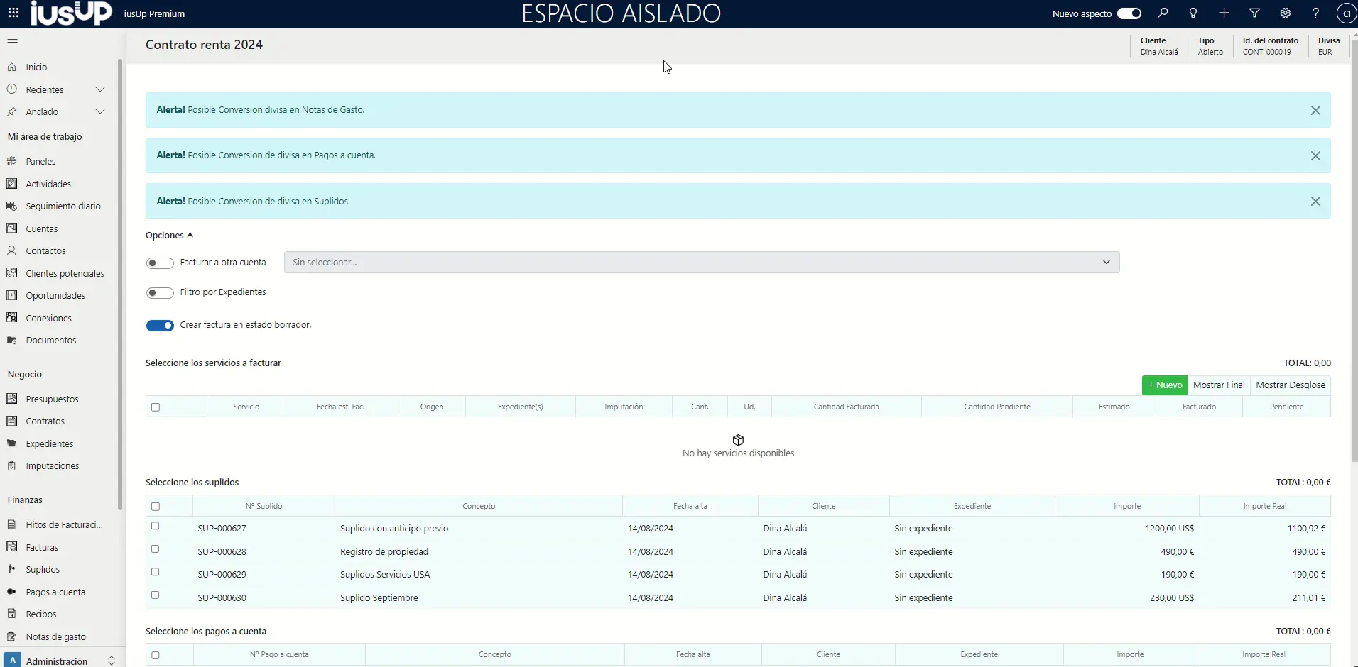 Si iniciamos un proceso de facturación, en primer lugar, podremos ver cómo el propio sistema nos avisa de que hay entidades expresadas en múltiples divisas. De esta manera, estaremos informados en todo momento de si estamos manejando más de una de ellas. Se trata de algo a título meramente informativo ya que, en todos los casos, iusUp se encargará de llevar a cabo su conversión de manera completamente automática.