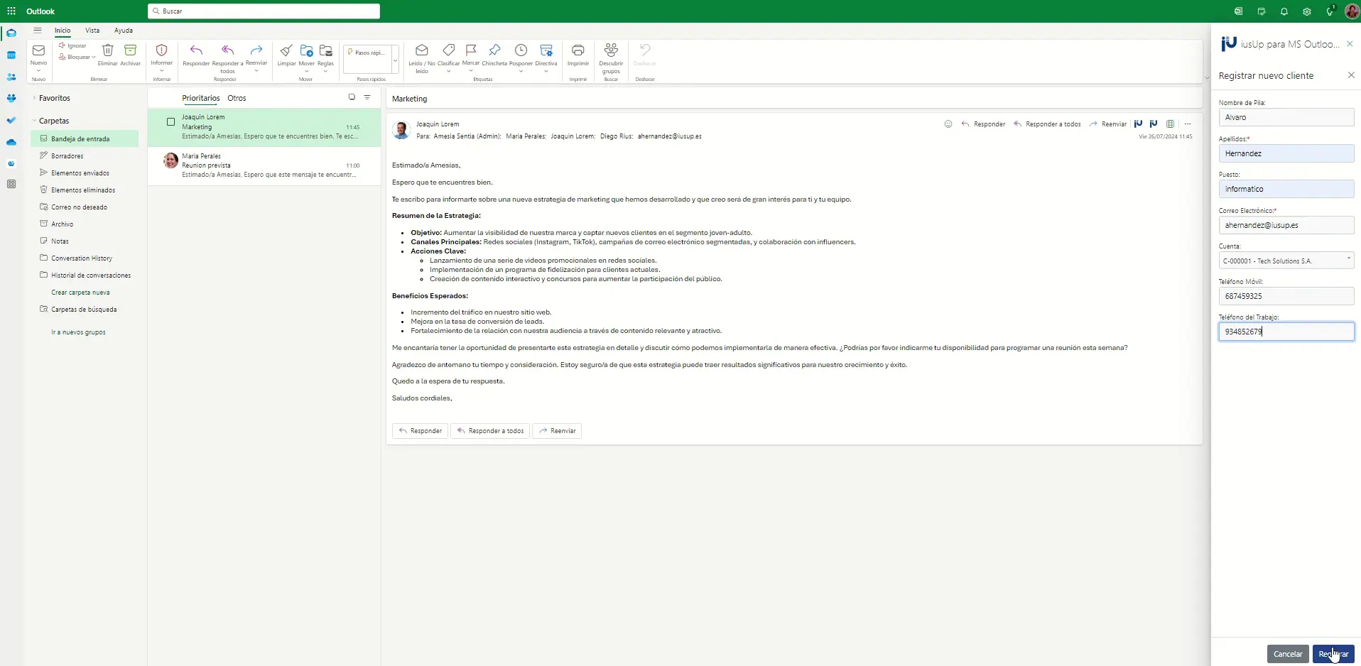 Las ventajas de usar el complemento para Outlook de iusUp para asociar direcciones de correo a contactos o clientes potenciales, tal y como hemos comentado en el apartado anterior, son realmente considerables. Veamos ahora cómo se lleva a cabo esta tarea a través de un ejemplo práctico.