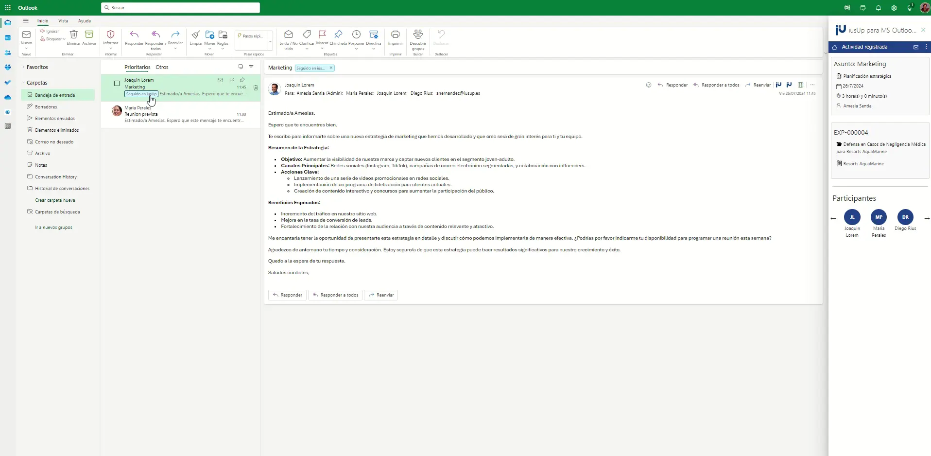 Con esta configuración ya establecida, bastará con indicar el Expediente correspondiente al correo del que queremos llevar a cabo un seguimiento rápido para poder hacerlo efectivo en el sistema. Como en el caso anterior, el propio Outlook incluirá en el correo correspondiente la descripción «Seguido en iusUp».