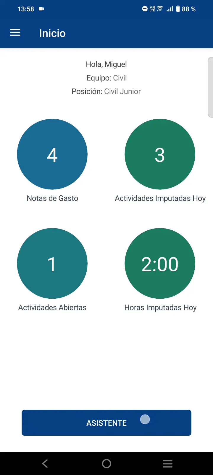 Para añadir horas con el Asistente de Imputación de la app de iusUp, en primer lugar, debemos pulsar el botón «Asistente» que se encuentra en la zona inferior de la página de Inicio.