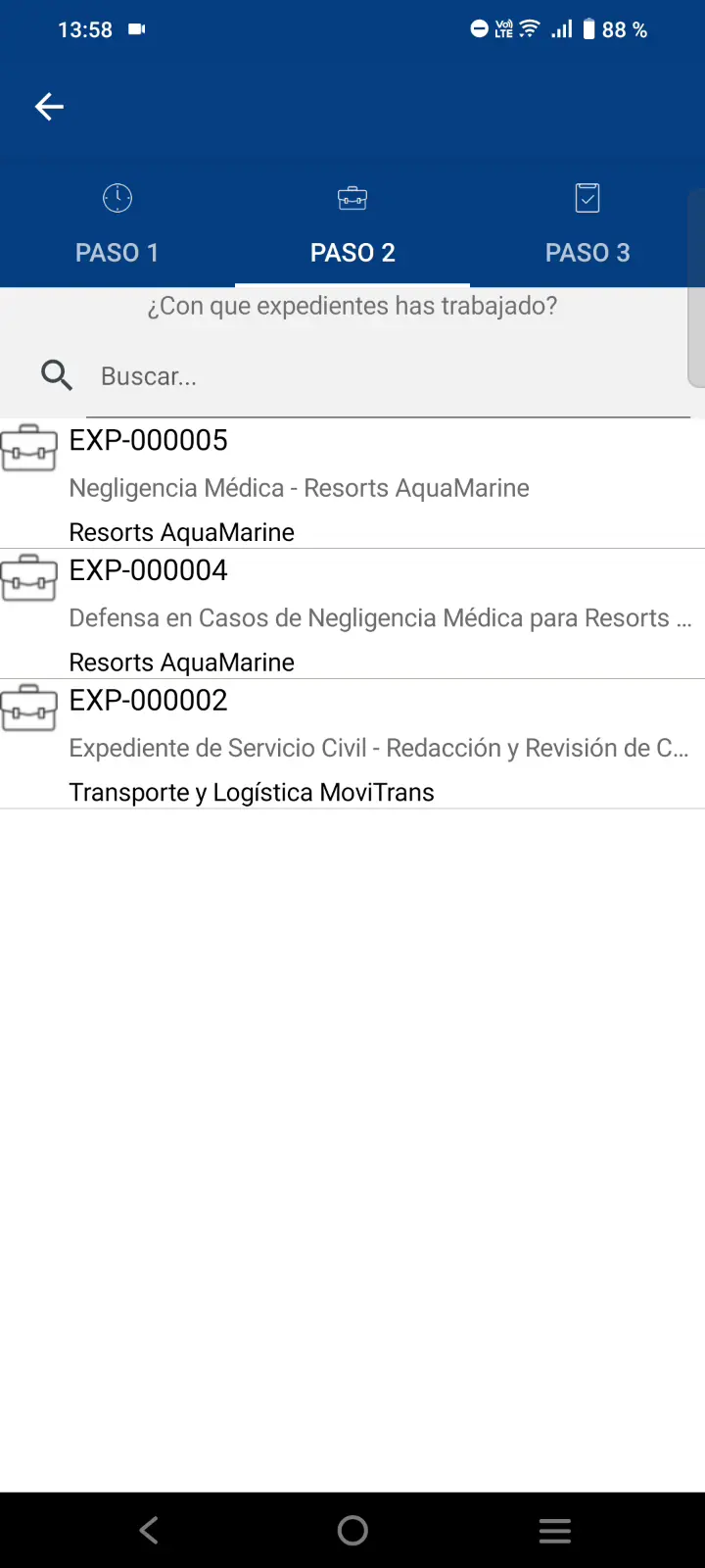 Seguidamente, accederemos al segundo paso, donde deberemos elegir el expediente o los expedientes a los que queremos añadirles las horas trabajadas. Para ello, podemos elegirlos a través del listado que nos ofrece el asistente. Y, también, podemos aprovechar la herramienta de búsqueda para proceder a su localización.