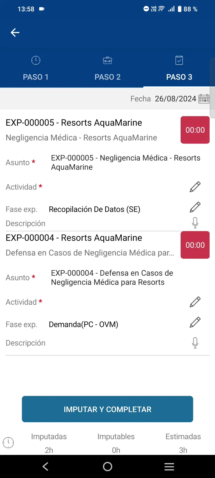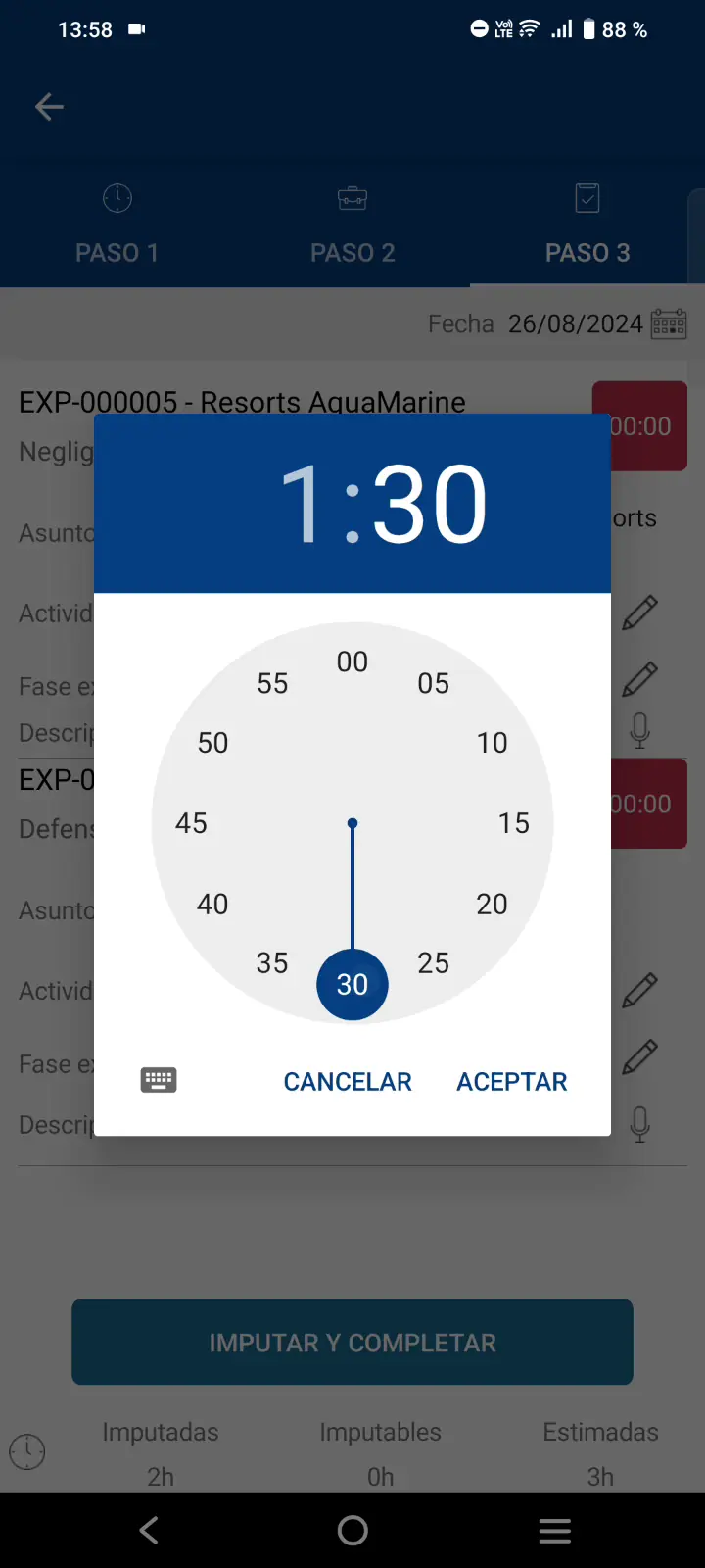 Con el expediente o los expedientes ya seleccionados, accederemos al tercer paso, donde podremos añadirles las horas que deseemos imputar, la actividad realizada, la fase del expediente y, si lo consideramos oportuno, una breve descripción aprovechando la herramienta de dictado, escribiéndola con el teclado o pegándola desde otra aplicación.