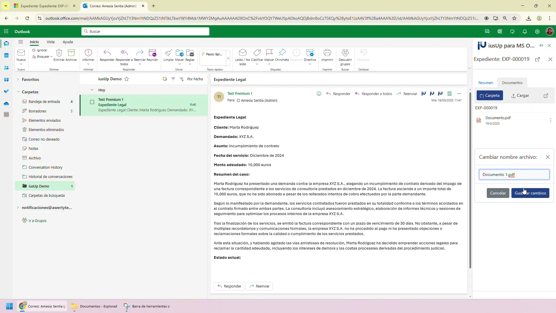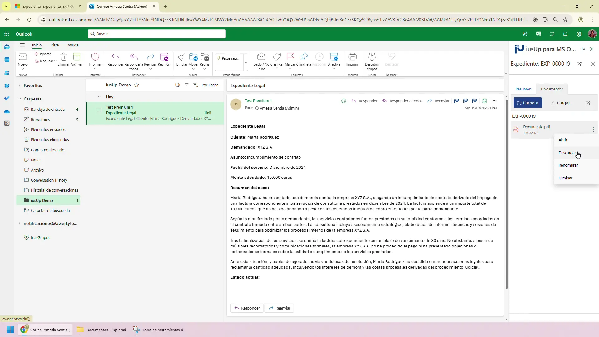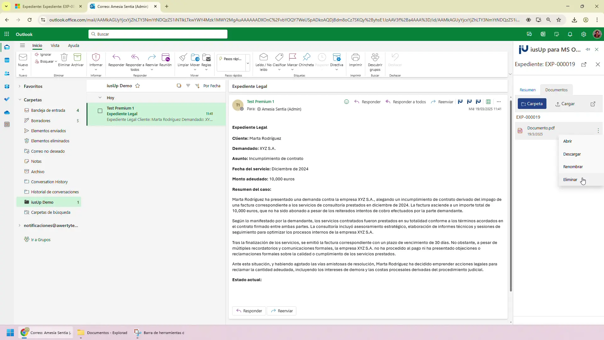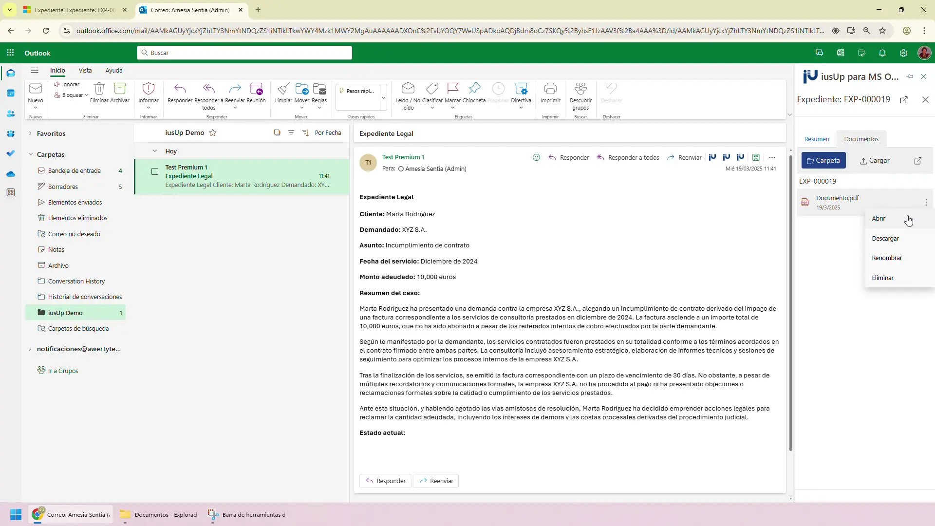 La gestión documental con el complemento para Outlook que ofrece iusUp es muy sencilla. Desde un Expediente, por ejemplo, solo tienes que hacer clic en el icono con forma de clip para poder acceder a toda su documentación relacionada almacenada en SharePoint. Una vez hayas dado este primer paso, puedes consultar o editar cualquier documento que forme parte del fondo documental relacionado con dicho Expediente. Para hacerlo, puedes hacer doble clic sobre el documento o clicar en los tres puntos situados a su izquierda y pulsar en la opción «Abrir». Así puedes verlo en la imagen que te enseñamos bajo estas líneas.