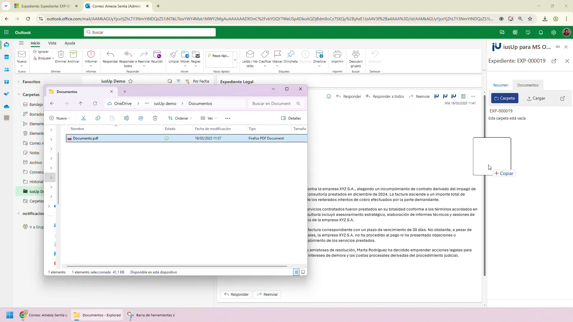 Si no hay ningún documento relacionado con el Expediente que tienes abierto en ese momento, o si deseas agregarle más documentación, mientras, puedes recurrir al gesto de arrastrar y soltar típico de Windows. Simplemente, tendrás que seleccionar el archivo que quieras incorporar haciendo clic izquierdo sobre él. Y, una vez hecho esto, manteniendo pulsado el botón izquierdo del ratón, llevarlo hasta la ventana del complemento para Outlook, con el Expediente con el que estés trabajando convenientemente abierto, y soltar el botón. Bajo estas líneas te mostramos una imagen a modo de ejemplo de esta acción.