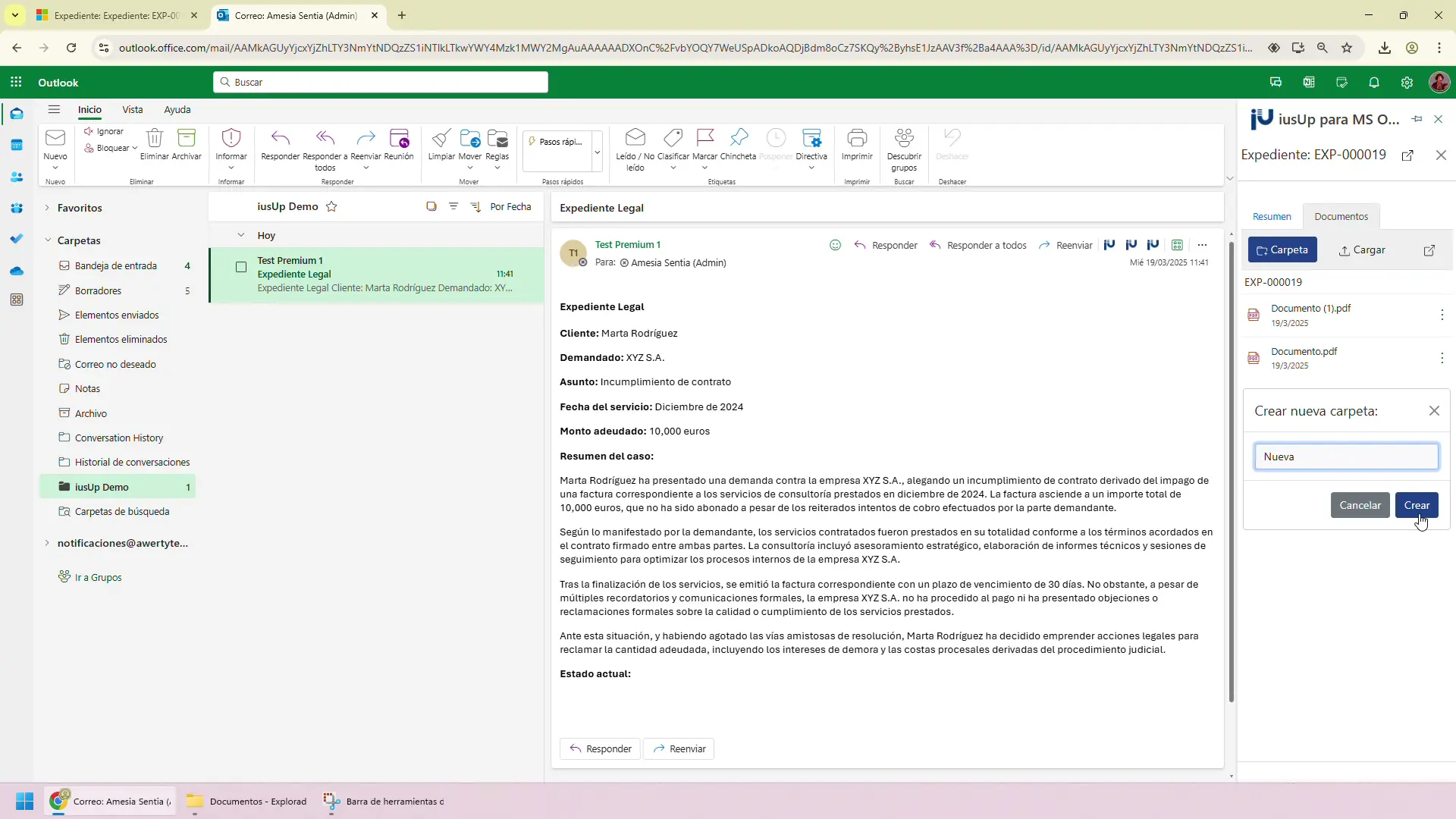 Por otro lado, también, puedes crear nuevas carpetas dentro del Expediente desde el propio complemento para Outlook. Ya sea para almacenar más documentos o para organizarlos de la manera que más te convenga en cada caso. Para ello, en primer lugar, debes hacer clic en la opción «Carpeta», situada en la pestaña «Documentos». A continuación, se abrirá un diálogo que te permitirá crearla con el nombre que consideres oportuno, tal y como puedes verlo bajo estas líneas.