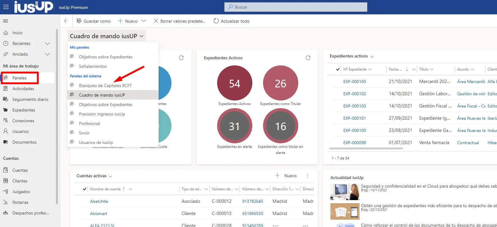 Para acceder a este panel, hay que clicar en el apartado «Paneles» de la barra lateral y seleccionar la opción «Blanqueo de Capitales BCFT» en el menú desplegable que se encuentra arriba a la derecha.