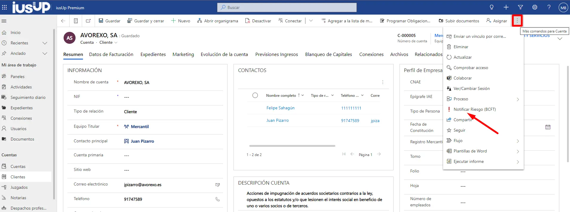 El sistema, además, incluye otra funcionalidad diseñada para ayudar a los profesionales en el cumplimento en la prevención del BCFT: las Notificaciones de riesgos. Mediante ellas, cualquier profesional del despacho puede informar al responsable de prevención BCFT de cualquier situación o caso de riesgo que haya podido detectar. Para aprovechar esta opción, simplemente hay que hacer clic en los tres puntos que aparecen a la derecha de la barra superior en las entidades Cliente, Presupuesto, Contrato y Expediente y seleccionar la opción «Notificar Riesgo (BCFT)».