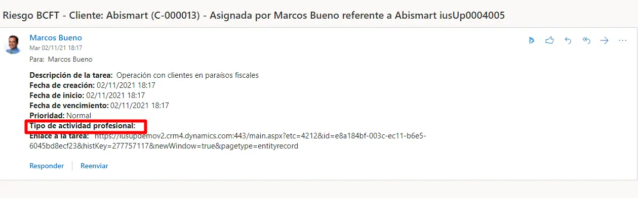 Tras hacer clic en dicha opción, el profesional accederá a un formulario en el que podrá describir la situación. Una vez lo haya hecho, en cuanto clique en «Guardar y cerrar», el sistema le enviará automáticamente un correo con la notificación al responsable. Y, además, se creará una actividad de seguimiento para la determinación de las medidas a tomar. Dicha información, además, podrá visualizarse en el Panel de Blanqueo de Capitales BCFT.