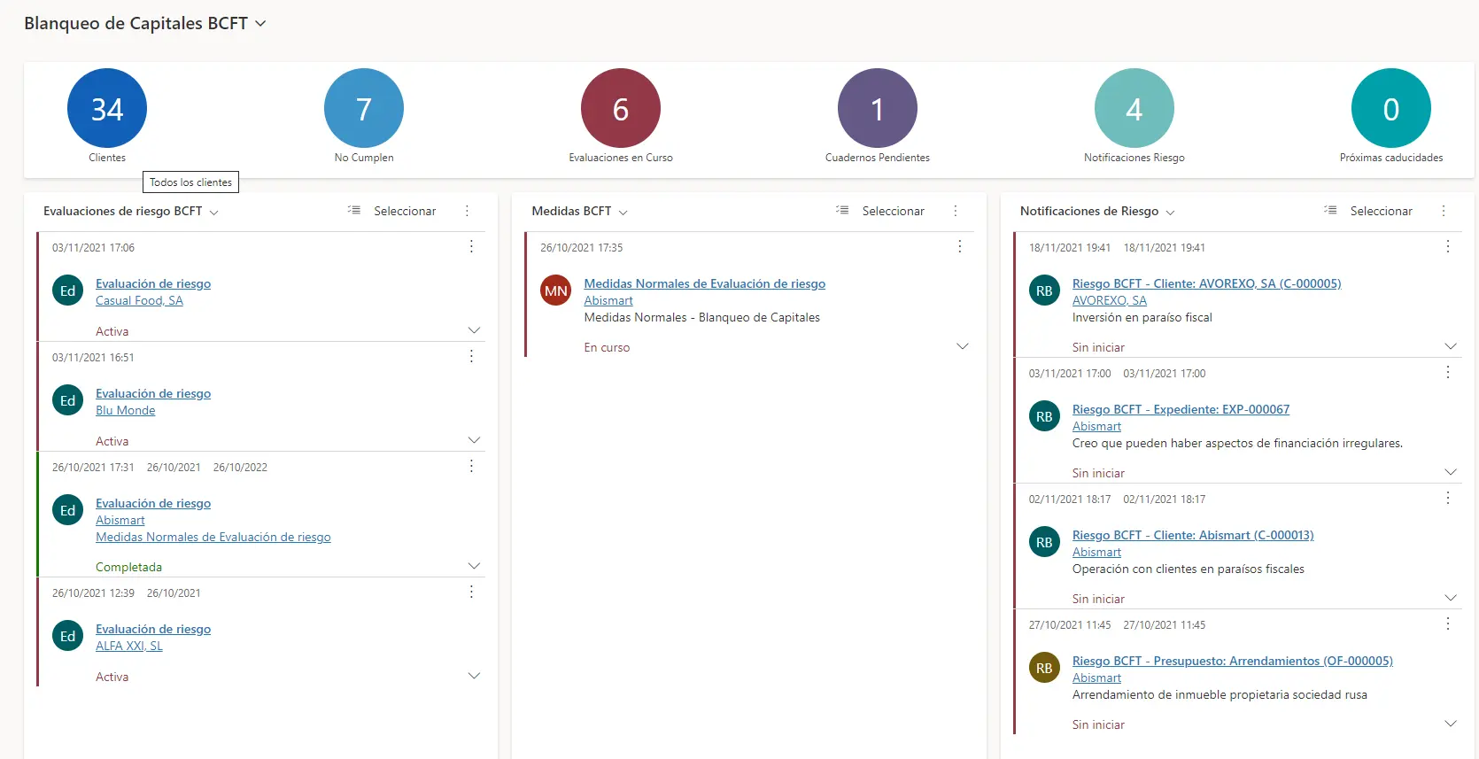 - Alarmas relacionadas con el cumplimiento BCFT. El módulo incluye un sistema de avisos sobre el cumplimiento BCFT que tiene en cuenta simultáneamente múltiples ámbitos: la cuenta del Cliente, el Presupuesto, el Contrato y el Expediente.