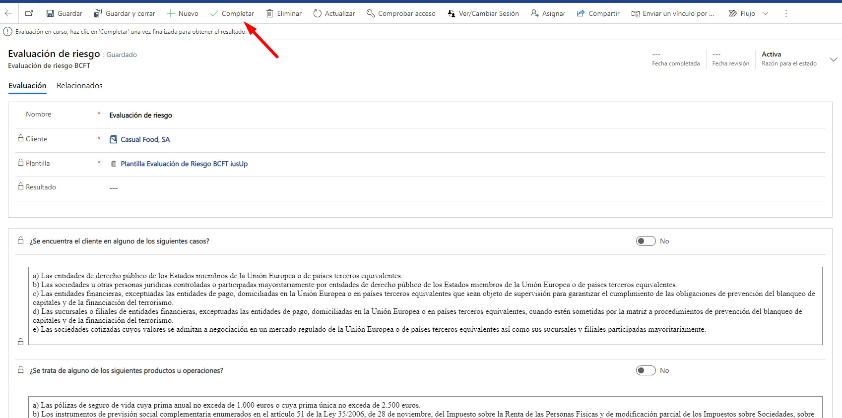 Al iniciarla, podremos elegir la plantilla que vamos a utilizar, ya sea la que viene por defecto con iusUp o bien una personalizada. Para completarla, simplemente tendremos que responder de forma afirmativa o negativa, por medio de un check, a las preguntas que nos planteen. Una vez hayamos terminado, simplemente tendremos que hacer clic en la opción «Completar», situada en la barra superior. Y el sistema, acto seguido, nos informará del tipo de medidas a seguir.