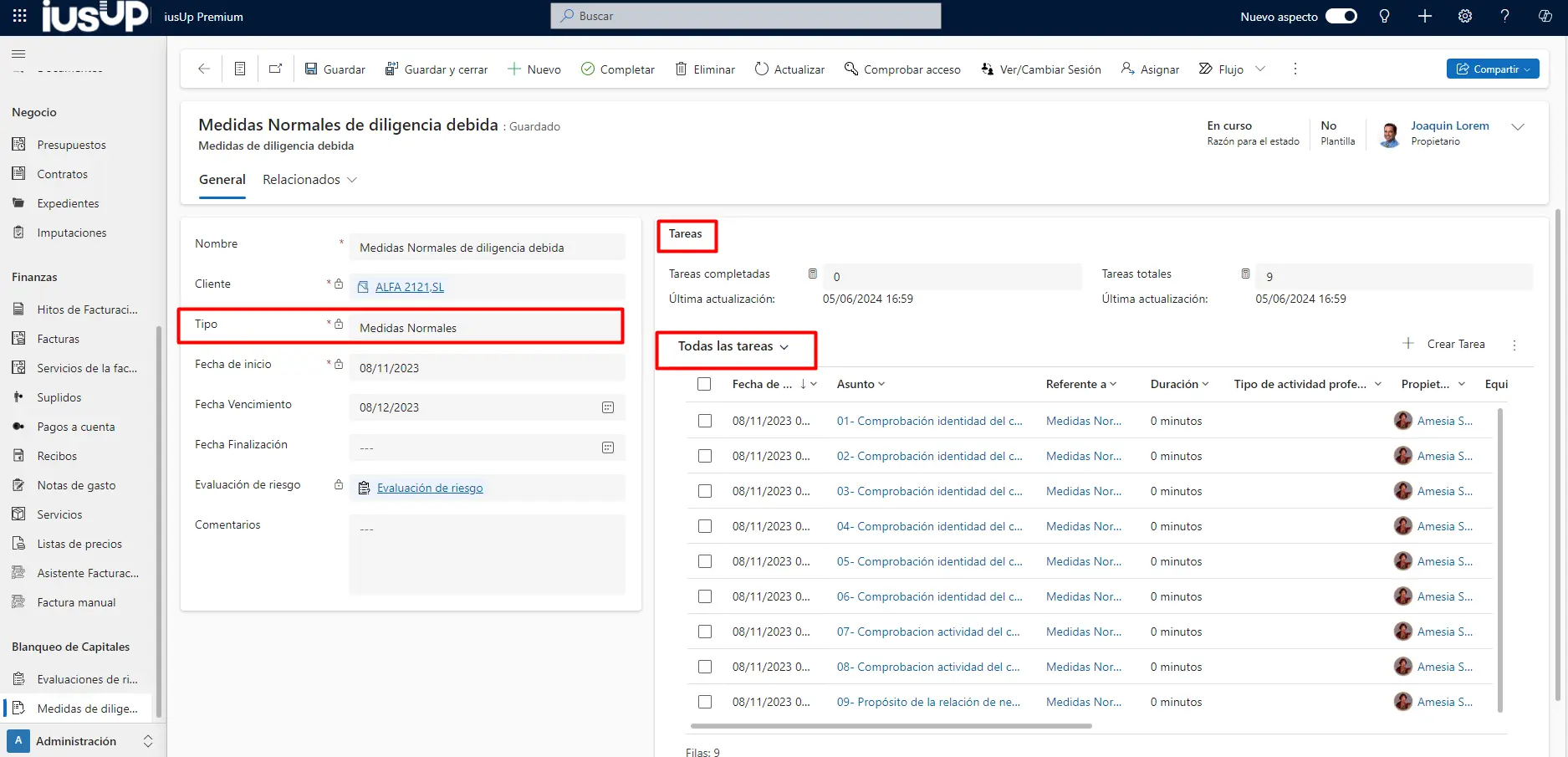 - Asistencia en la implementación de medidas de diligencia debida. El módulo BCFT te ayuda a controlar y gestionar todas las actividades que deben ser llevadas a cabo de acuerdo con las medidas de diligencia debida que se hayan determinado de acuerdo con tes categorías: simplificadas, normales o reforzadas.