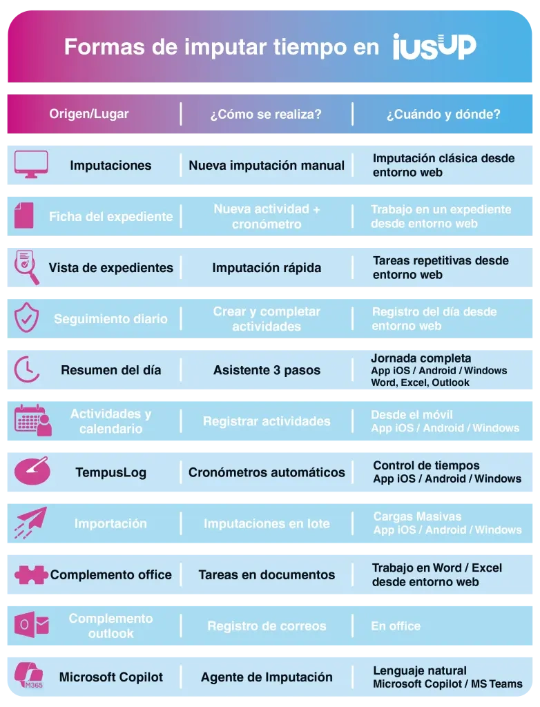 Con iusUp puedes imputar tus horas trabajadas desde la propia interfaz de nuestro software, a través del apartado «Imputaciones». También, desde la ficha del Expediente o la vista del Expediente con el que estés trabajando en ese momento. O, si lo prefieres, desde Seguimiento Diario, mientras repasas las actividades que tienes pendientes de realizar en una fecha concreta o le echas un vistazo a las que ya cerraste en el pasado. Además, cuentas con la funcionalidad Resumen del Día, tanto en la app como en los complementos para Office y Outlook, que te permite hacerlo en un proceso guiado a través de varios pasos. Si lo prefieres, también podrás aprovechar toda la potencia de Copilot. E, incluso, la nueva funcionalidad Tempus Log, que estará en breve disponible en la app. Solo, por citar algunas de las opciones que tienes. Bajo estas líneas puedes ver un gráfico en el que te las mostramos todas, con sus detalles más destacados.