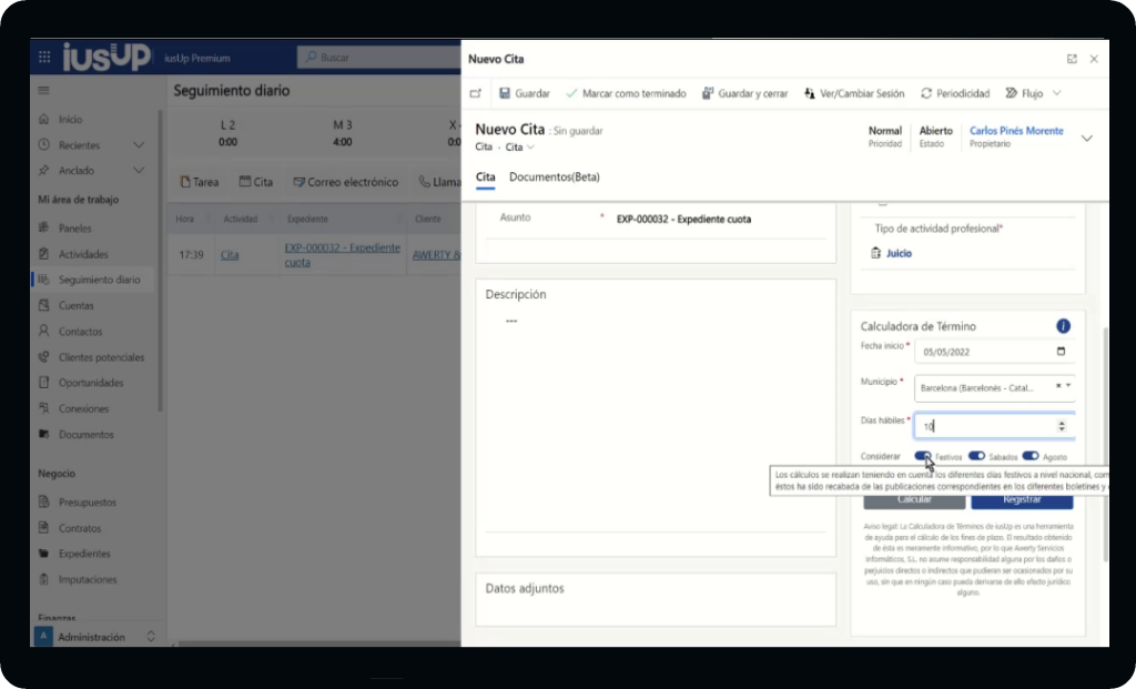Gracias a la integración de la Calculadora de Términos con iusUp puedes establecer un plazo al generar una nueva actividad indicando tanto el Tipo de actividad como el Expediente al que pertenece y el sistema incluirá el término como un atributo más de esa actividad.